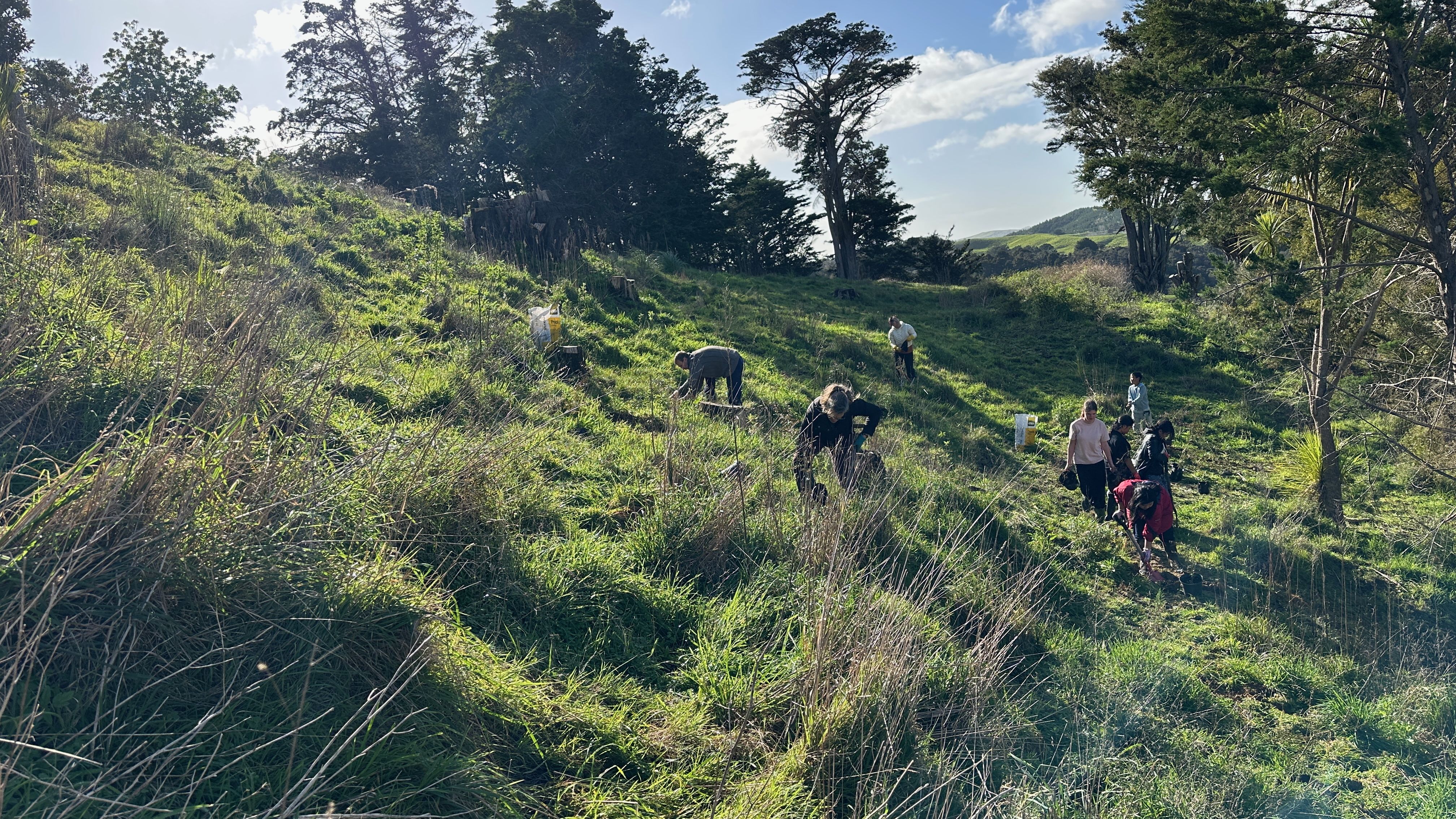 Carl and Teresa Robson from Drury Church and Christian school community brought up a team of young people from many cultures for a bush working bee. We had an awesome time of fun and fellowship amongst a full workday. Planted 40+ Totara trees, and some Manuka and Karamu where Cyclone Gabrielle had devastated an entire slope (Southern side. They planted 8 Kauri in the bush in a light-well caused by downed trees plus 20 Lomandra grasses, 6 Kawakawa plus Flax on the slope in front of Okahu House.