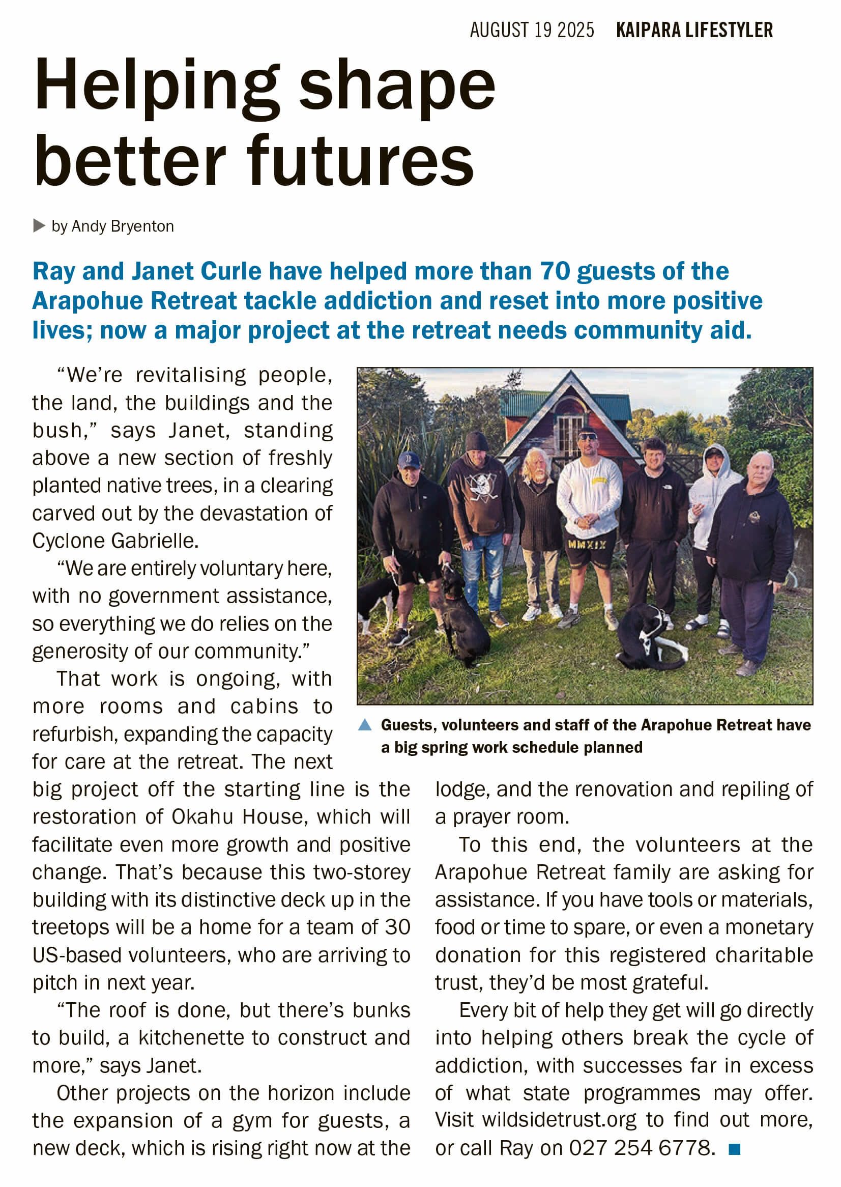 Thanks to our local newshound Andy Bryenton we scored an August article in the Kaipara Lifestyler. It's time to look back and celebrate how far we've come, having helped many people and restored many buildings and much land over 4.5 years.